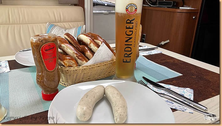 Helgas Begleitung auf der Morgenrunde sind Schirm und Regenjacke und somit sind die sportlichen Betätigungen für heute auch schon erschöpft. Der Regen hält sich bis zum späten Nachmittag noch in Grenzen, allerdings macht sich der angekündigte Wind langsam bemerkbar. Wir erwarten für die kommende Nacht und in den nächsten 2 Tagen Starkregen und Sturm. Bärbl und Klaus kommen zum Apero zu uns, zum Weißwurstessen sind dann wir eingeladen. Auch so kann man einen ziemlich unfreundlichen Tag nett und angenehm verbringen und weitere Ideen gehen uns bestimmt nicht aus. |