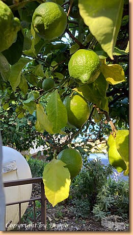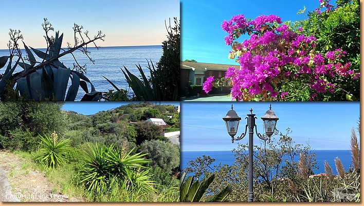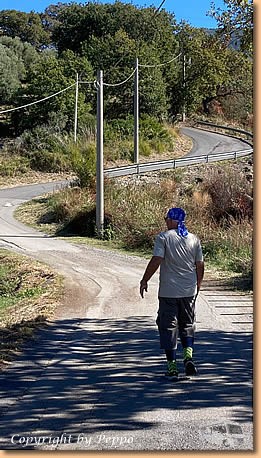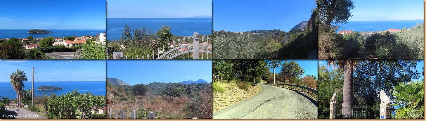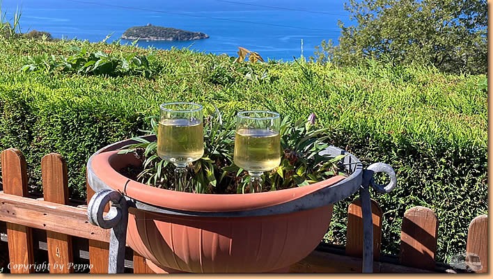 | Heute machen wir einen Ausflug in luftige Höhen. Gleich gegenüber des Stellplatzes geht die ziemlich kurvenreiche und einigermassen steile Contrada Cammaratea Richtung Ristorante La Stella dell' Isola. Es ist ziemlich warm und so sind wir nach 3 km froh, uns auf der Terasse niederzulassen und bei herrlicher Aussicht einen halben Liter vino bianco und Wasser zu geniessen. |