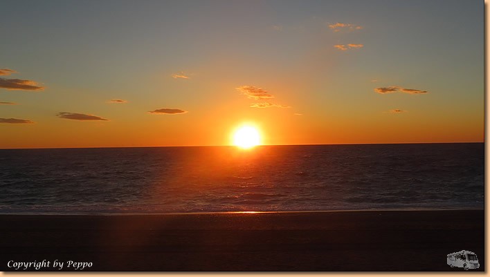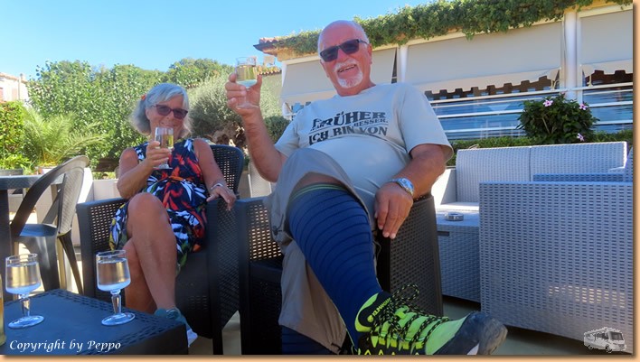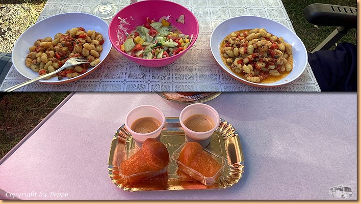 | Für uns gibt's leider nichts, also heisst es nach vielen Stufen auf und ab wieder auf die Räder und runter in die Stadt. Am Retourweg gehts dem Lungomare entlang und da finden wir in Santa Maria del Cedro ein nettes Restaurant. Wir haben zwar schon besser gegessen, aber im Grossen und Ganzen passt es auch. Nach 34 km treffen wir wieder daheim ein. Runter vom Rad, hinein ins Wasser und dann die Sonne vorm Womo geniessen. Wieder geht ein schöner Tag zu Ende, schön war's, ciao bis morgen! |