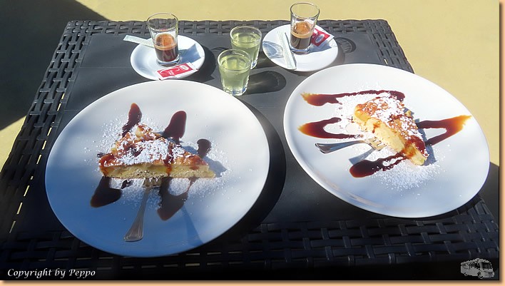 | Freundliches Personal, alles perfekt sauber, die grosse Überraschung kommt allerdings vom Chef persönlich. Beim Bezahlen, 10 € für unsere Getränke, werden wir auf zwei Espressi eingeladen. Was wir allerdings serviert bekommen verschlägt uns die Sprache. 2x Kaffee, 2x Cedroschnaps und 2x Apfeltorte. Natürlich wollen wir bezahlen, geht nicht, wir sind darauf eingeladen und damit basta. |
