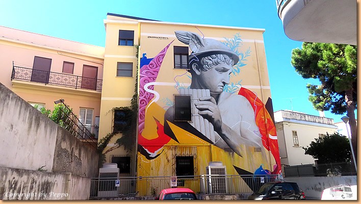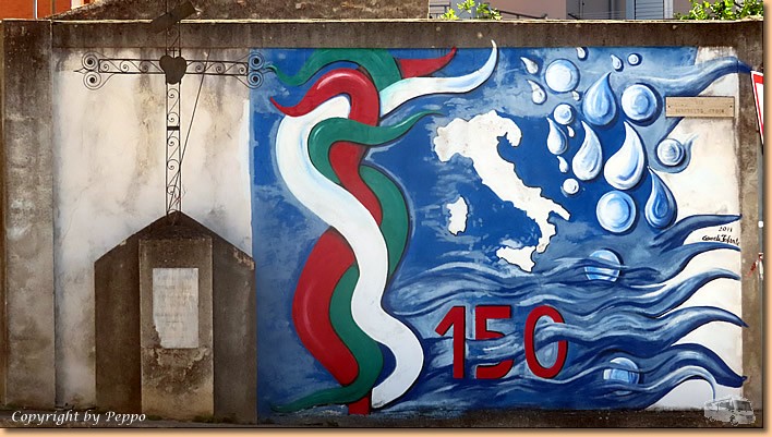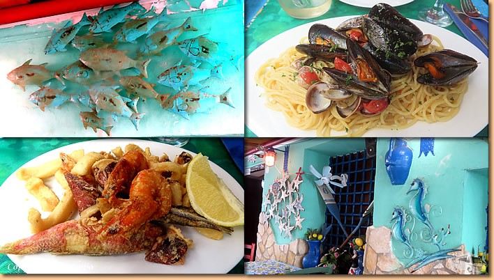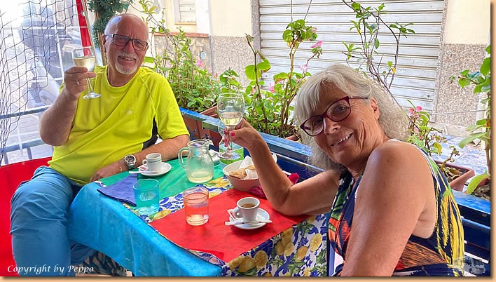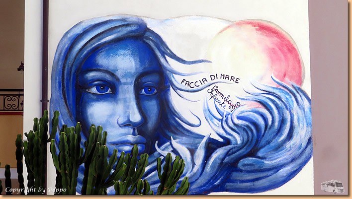 | Das Tagesmenü in der Osteria dei Murales sticht uns ins Auge. Der einzig freie Tisch auf der Terasse gehört uns und wir werden nicht enttäuscht. Spaghetti Frutti di Mare und Fritto misto di Pesce schmecken hervorragend, das Preis-Leistungsverhältnis passt perfekt. Zufrieden treten wir den Heimweg an, schnell noch ins Mare und dann kommt der Kalender zum Einsatz. |