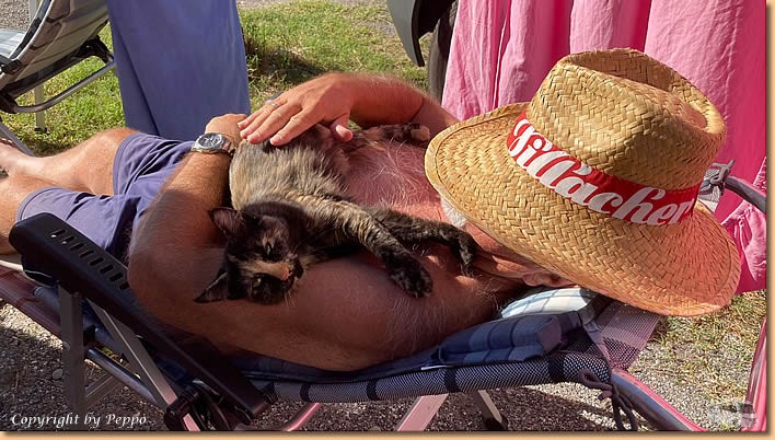| Gottseidank bekomme ich schnurrende Unterstützung, gemeinsam faulenzt es sich gleich leichter. Nach dem Bad wir die Bordküche aktiviert. Das Ergebnis "Gnocchi mit Thunfisch, Tomaten und Kapern" schmecken ausgezeichnet und das Dessert, "Baba auf Rum" rundet unser Mittagessen perfekt ab. |