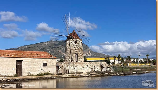 | Da wir morgen ins Bergdörfchen Erice wollen organisiert uns der Platzchef für 10 Uhr ein Taxi und dann soll es mit der Seilbahn nach oben gehen. Während ich einige Arbeiten am Womo erledige marschiert Helga ca. 4 km um eine Kleinigkeit einzukaufen. Vorbei an Salzhügeln, Windmühlen und natürlich den gefiederten Bewohnern der Saline kommt sie mit ein paar netten Fotos wieder nach Hause. |