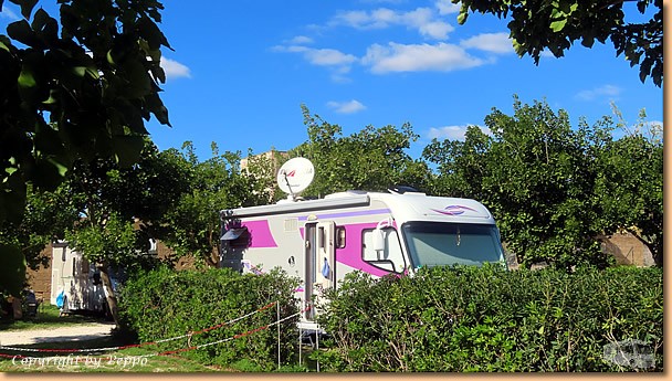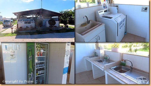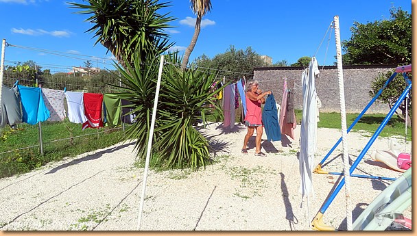 | Vom Chef Marco herzlichst begrüsst dürfen wir uns eine Parzelle aussuchen, Sesseln und Tisch heraus und dem Ankommensschluck steht nichts im Wege. Dann wird ein wenig gearbeitet, Antenne montieren, die Waschmaschine hilft zwar, aber aufhängen muss man die Wäsche auch. Zwei Maschinen sind voll, gottseidank gibt es jede Menge Leinen am Platz. |