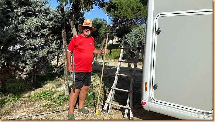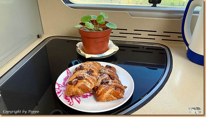 | Eine ruhige Nacht liegt hinter uns und Helga's Morgenrunde ins Naturschutzgebiet fällt zu ihrer Zufriedenheit aus. Ein paar Neuigkeiten gibt es, alles in allem passt es und wir werden gemeinsam in den nächsten Tagen den Park erkunden. Der Bäcker ist auch wieder da, mit einer Änderung, jetzt fährt sein Sohn die guten Sachen aus. |