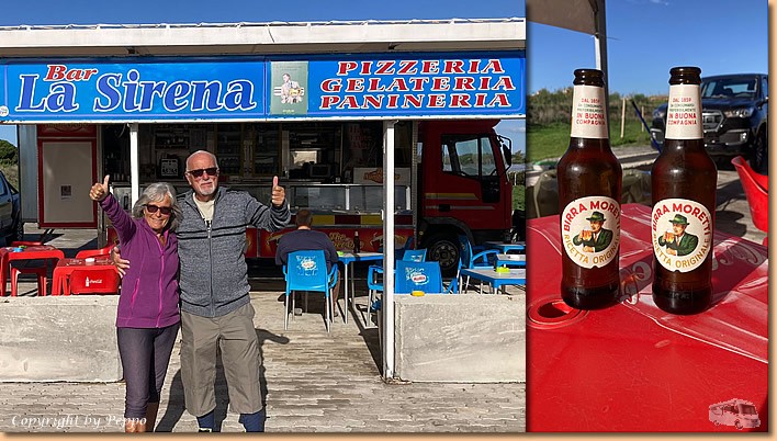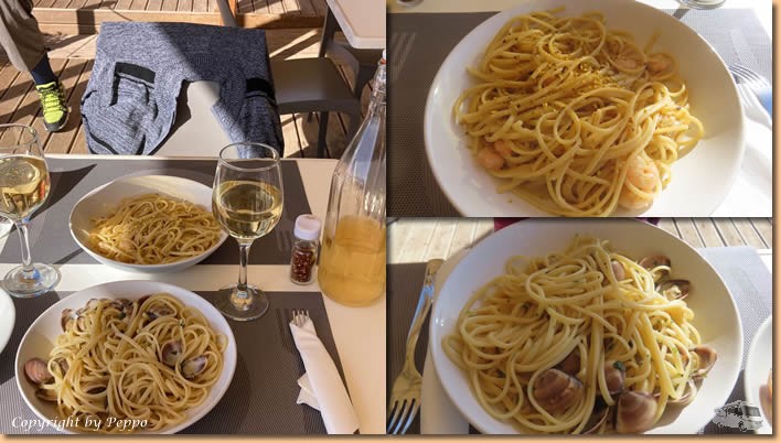 | Es hat sich nichts geändert, wir sind wieder voll zufrieden und werden sicher öfters auf Spaghetti und vino vorbeikommen. Am Retourweg noch einen Absacker in der Bar Sirena. Die alte Bar nach der Brücke in Punta Braccetto hat geschlossen, die neue steht als "Mobilbar" auf dem Parkplatz rechts vor der Brücke. |