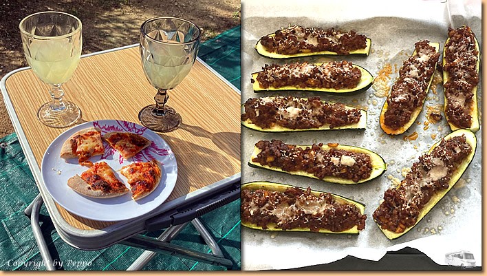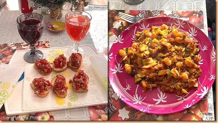 | Wir überlassen den Einheimischen die Stadt und fahren nach einem Einkauf wieder retour. In Cassuzze ist es ruhiger, wir machen Pause und geniessen einen Aperitivo. Daheim plündern wir den Kühlschrank, das Ergebnis ist ein super schmeckender kunterbunter Auflauf. |