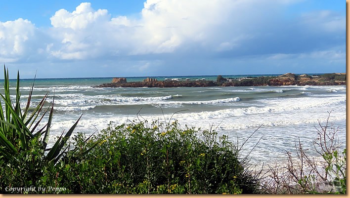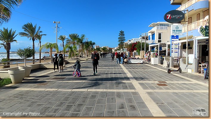 | Das Wetter ist o.k. und wir sitzen schon auf den Rädern nach Marina di Ragusa. Wir radeln unsere Runde, verändert hat sich nichts, der sonntägliche Italienerauflauf ist nach wie vor vorhanden. Am Lungomare und am Hauptplatz gibt es fast kein weiterkommen, Bars und Restaurants voll belegt. |