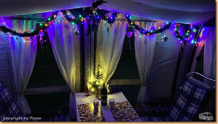 | Das Ergebnis der Hüttenschicht, unser Vorzelt erstrahlt im weihnachtlichen Glanze. Natürlich gibt's eine Lichterprobe, Glühwein und Lebkuchen dürfen dabei nicht fehlen. Morgen wird im Womo dekoriert, das Prozedere mit Glühwein wiederholt sich selbstverständlich. Morgen wollen wir radeln, schauen wir mal ob der Wettergott dazu sein Einverständnis gibt. |