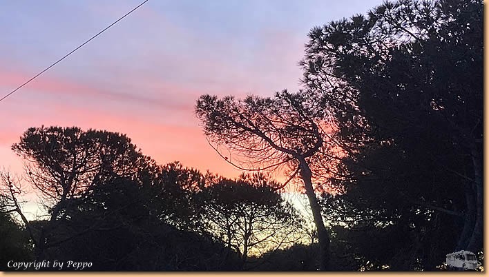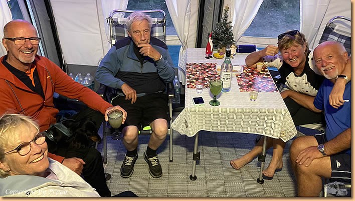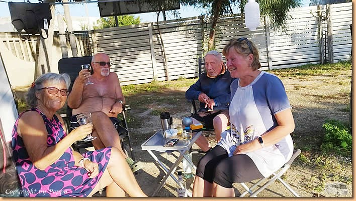 | Nach ca. 8 km treffen wir daheim ein wo ein wohlverdienter Limoncello-Spritz auf uns wartet. Und dann kommt Ulrike vorbei, Wolfgang folgt und mit Birgit und Volker sind die Nachbarn komplett. Es wird ein netter Nachmittag, zum Plaudern gibts immer viel und die Zeit geht dementsprechend schnell vorbei. Rückzug ins Womo, alle Schreibarbeiten erledigen, noch ein bisschen fernsehen und dann wünschen wir allen eine gute Nacht. |
