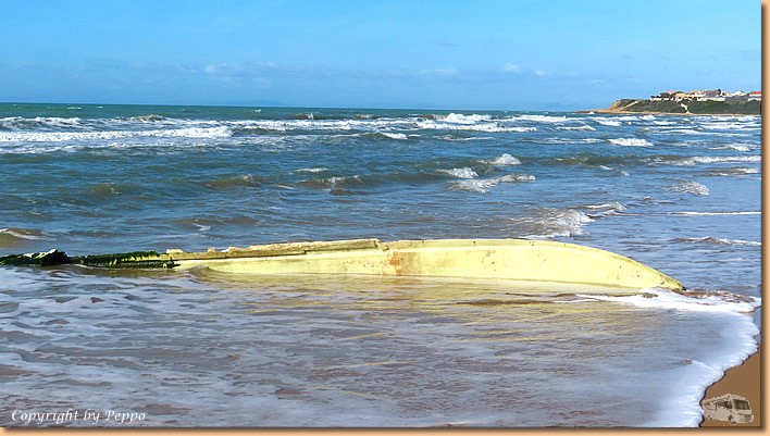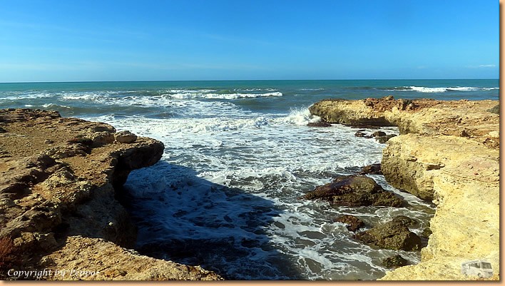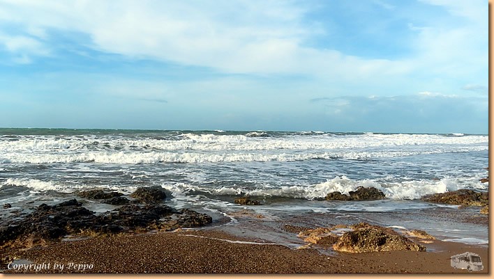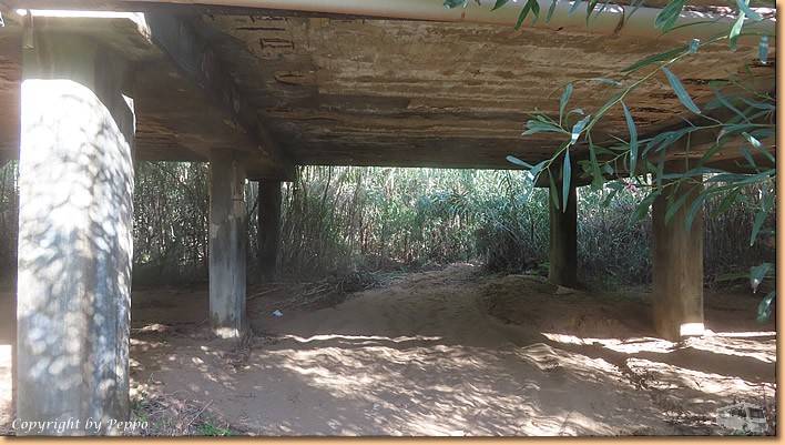| Es erwartet uns ein wunderschöner Tag. Sonne pur, kein Wind, das Meer lädt auch zum Baden ein - Herz, was willst du mehr. Wir wollten einen ruhigen Tag einlegen, mit Sonnenliegen und Nixtun. Dann wird aus einer geplanten Minirunde unter der Brücke durch das ausgetrocknete Flussbett hindurch ein etwas längerer Marsch. |
