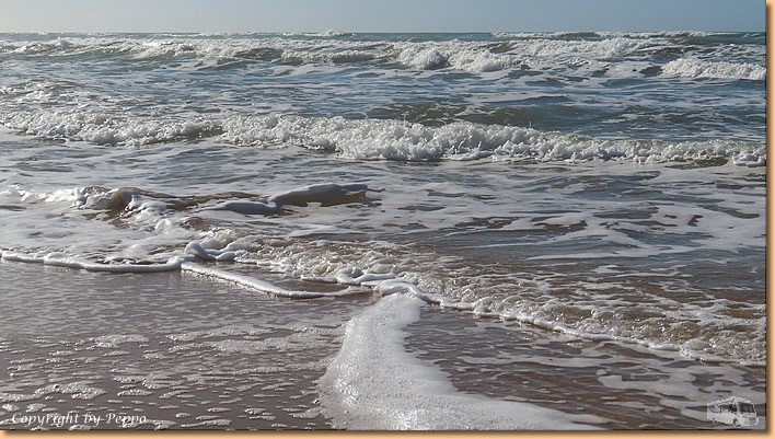 | Bei uns ist am Vormittag Arbeit in und ums Womo angesagt. Gegen Mittag kommt wieder Wind auf und es geht sich nur eine gemeinsame kleine Platz- und Strandrunde aus. Für mich nicht so schlimm, gibt es doch heute im Fernseh Sport ohne Ende. Helga bekommt Besuch von Ute und so kann man auch den windigen Nachmittag angenehm verbringen. |