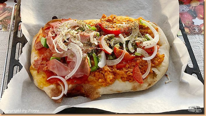 | Eine Pinsa, belegt mit den Resten aus dem Kühlschrank, schmeckt gar nicht so schlecht, alles in allem, ein perfekter Tag. |