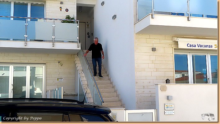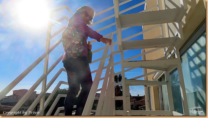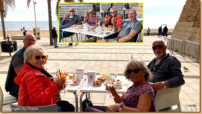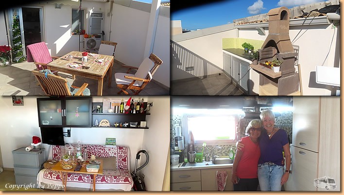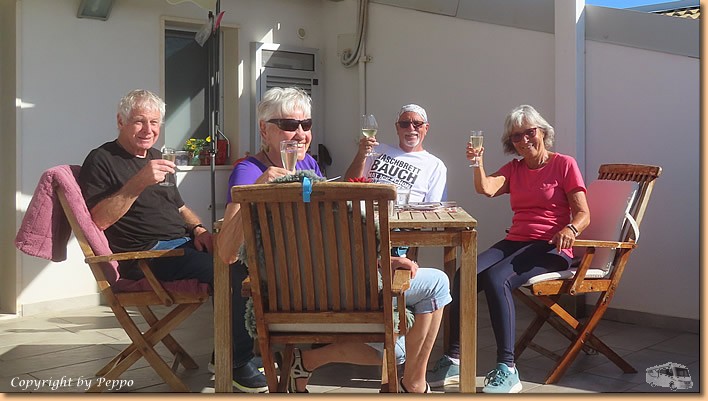 | Um 10:30 Uhr sind wir startklar. Räder raus und auf geht's nach Punta Secca. Wir sind bei Gabi und Klaus eingeladen. Unsere Freunde haben sich nach vielen Jahren vom Camperleben verabschiedet und verbringen nun den Winter in einer Ferienwohnung. Wir sind voll begeistert, da passt einfach alles. Perfekt eingerichtet, Dachterasse, Blick aufs Mare, Aussenküche, Griller, wir freuen uns sehr für sie. |