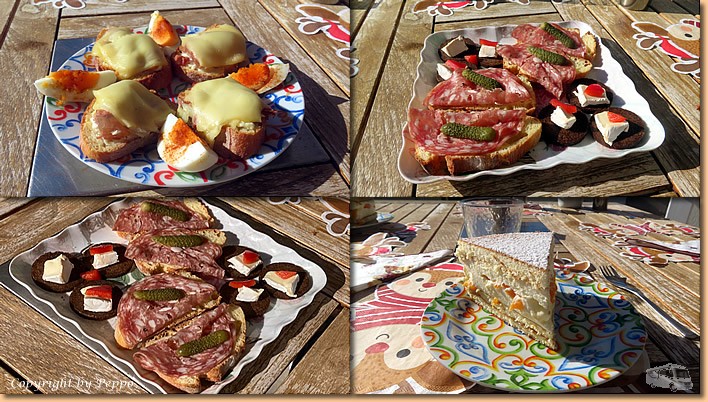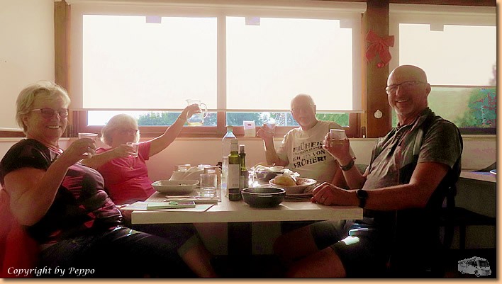 | Klaus zaubert wieder verschiedene gute Aperitivi auf den Tisch, Gabi steuert eine ausgezeichnete Topfentorte bei, herzlichen Dank für das nette Zusammensitzen. Nach 4 Stunden sagen wir wieder ciao und freuen uns auf ein Wiedersehen bei uns am Platz. Wir radeln wieder heim und bevor wir uns ins Womo zurückziehen machen wir es uns im Vorzelt gemütlich. |