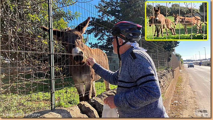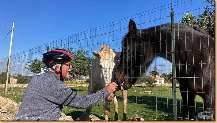 | Es wird wieder ein schöner Tag und den wollen wir auch ausnützen. Helga's 11km Morgenrunde und ein Bad im Mare machen den Anfang, dann kommen die Räder zum Einsatz. Wir fahren nach Santa Croce wo unsere vierbeinigen Freunde schon auf uns warten. |