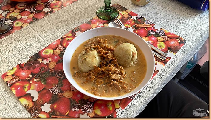 | Eierschwammerlgulasch mit Semmelknödel gibt's zu Mittag, ein bisschen Heimat auf Sizilien muss auch sein. Morgen sind wir wieder on Tour, für heute einen schönen Abend und später eine gute Nacht. |