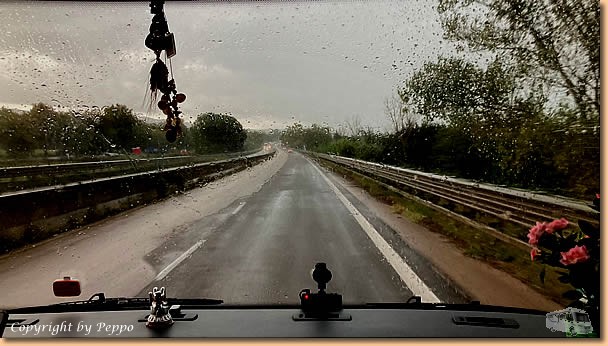 | Unseren heutigen Reisetag werden wir lange nicht vergessen. Kaum sind wir abfahrtsbereit wird es wirklich finster und es fängt zu regnen an, auf der SS1 schüttet es dann wie aus Kübeln. An solche Wassermassen können wir uns gar nicht erinnern, zeitweise fast gar keine Sicht. Da hilft nur eines, entweder rechts ran fahren oder die Nerven behalten und mit vollster Konzentration langsam weiterfahren. Ich entscheide mich für's Fahren, nach ca. einer Stunde hört der Starkregen schlagartig auf und wir können durchatmen. Unser Navi macht mit dem Unruhestiften weiter. Mit der Meldung, dass uns auf der SS1 eine Sperre bevorsteht will es uns ständig ableiten und schlägt uns einen Umweg von ca. 200 Kilometer vor! Da auch die Italiener weiterfahren ignorieren wir die Sache und tun gut daran. Ohne Probleme kommen wir von der SS1 auf die A12 und weiter geht es Richtung Rom. Nicht lange, kommt die Meldung runter von der Autobahn. Wir folgen brav, kurven auf vollgeparkten Strassen durch die nächste Ortschaft und werden dann, völlig überraschend, an der nächsten Autobahnauffahrt wieder auf die A12 geschickt. Zweimal hintereinander müssen wir auf einer Mautstelle ohne Ticket bezahlen, einmal bekommen wir das Geld retour und der Schranken öffnet trotzdem. Schauen wir mal, ob wir Post bekommen werden. |