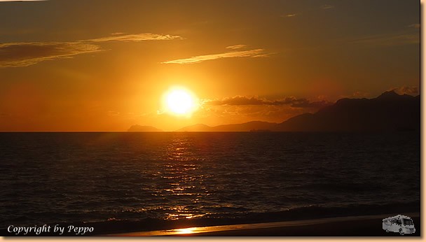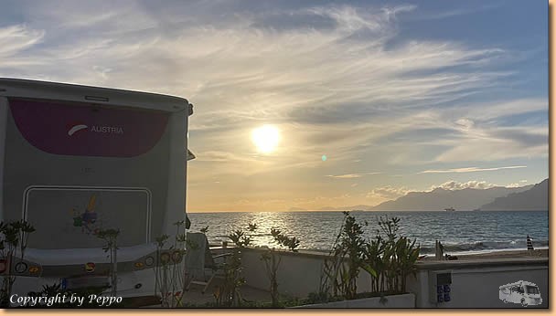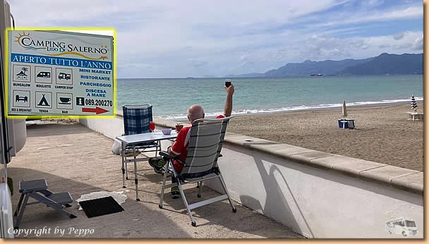 | Wir checken am ziemlich vollen Camping Lido di Salerno ein, ein freundlicher Mitarbeiter weisst uns einen perfekten Platz direkt mit Blick auf's Mare zu. Wir sind mehr als zufrieden und beschliessen sofort ein paar ruhige Tage einzulegen. Ganz so ruhig werden sie wohl doch nicht werden, aber morgen ist ein Faulenzertag angesagt. |