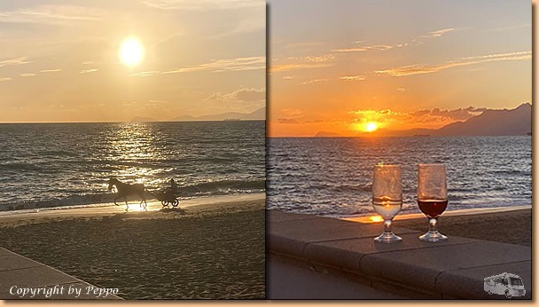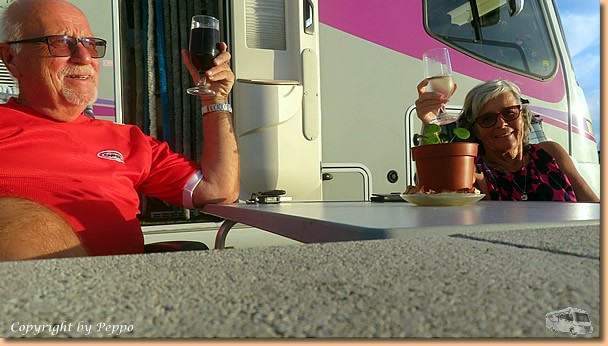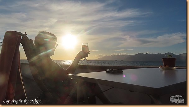 | Helga geniesst ihr erstes Bad im angenehm warmen Wasser, ich schaue mich am CP um, finde alles o.k. und somit haben wir eine gute Wahl getroffen. Sonne, Meer, ein Glas vino, wir fühlen uns wohl und wünschen allen einen schönen Tag und eine angenehme Nacht. |