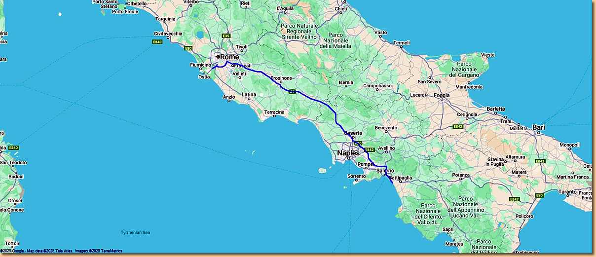 | Für uns geht es heute wieder ein Stück weiter. Diesmal bei Sonnenschein und ohne grosses Verkehrsaufkommen kommen wir nach rund 280km nach Salerno und ein paar Kilometer weiter erreichen wir in Magazzeno unser Etappenziel. |