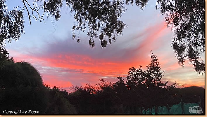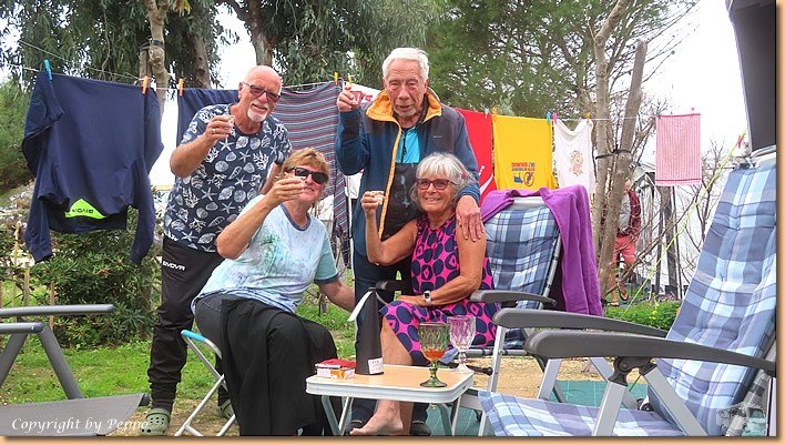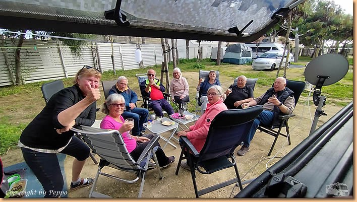 | Ein bisschen muss man die Ankunft des neuen Jahres doch feiern. Aus uns vier werden bald neun, Franz und Rosmarie kommen dazu, Ute trifft auch ein und Heidi und Jürgen machen das Zusammensitzen komplett. Nett war's, dankeschön, leider fällt das Neujahrsschwimmen der Gemütlichkeit zum Opfer, wird aber verlässlich morgen nachgeholt. Die Sonne verschwindet hinter den Wolken, wir treten den Rückzug ins Womo an und wünschen allen einen schönen ersten Abend im Jahr 2026. |