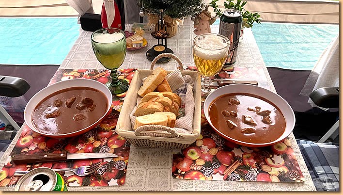 | Nach 26 km treffen wir daheim ein und keine 10 Minuten später sitzen wir bei unseren Nachbarn Rosmarie und Franz. Unser Chardonney und der Panettone unserer Freunde werden verkostet, danke für's nette Zusammensitzen, nett war's. Auch mit unserem verspäteten Mittagessen sind wir zufrieden, Gulasch und Bier schmecken auch auf Sizilien. |