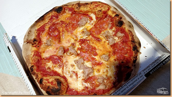 | Heute ist wieder Pizzatime, d.h. ich bin für Bestellung und Transport verantwortlich. Die Pizzeria getreten voll, kein Wunder, sie schmecken hervorragend und brauchen auch keine 5 Minuten bis sie bei uns am Teller im Womo landen. Ein gemütlicher Tag geht zu Ende, schauen wir mal ob wir morgen etwas unternehmen oder ob wir es uns wieder gemütlich machen. |