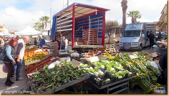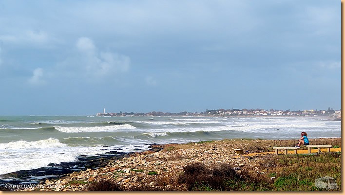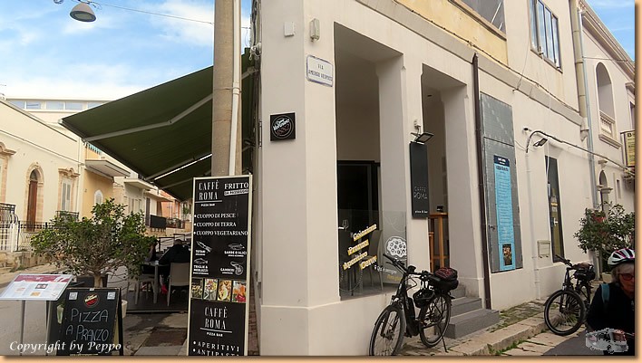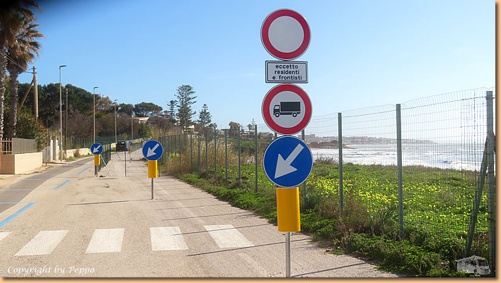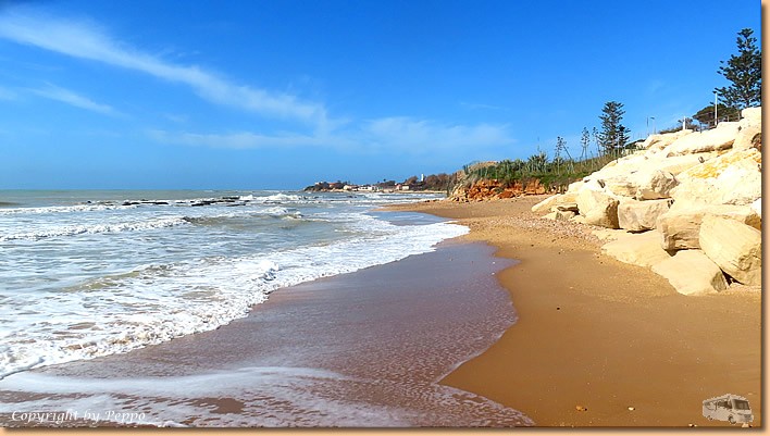 | Nach einer windstillen Nacht erwartet uns heute ein wunderschöner Tag. Natürlich nützen wir ihn und radeln nach Marina di Ragusa. In Punta Secca arbeitet man noch fleissig an den Unwetterschäden, die Steinskulpturen am Strand vor Caucana sind leider auch nicht mehr zu finden. Unsere Bar am Hauptplatz hat leider noch geschlossen, also geht's nach dem Einkaufen flott nach Hause. |