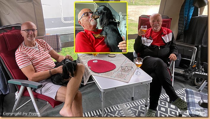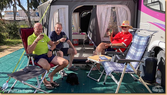 | Wir sitzen nicht lange alleine in der Sonne vorm Womo, erst gesellt sich Volker mit Ayla dazu, dann kommt Peter mit seiner Baria und unseren Nachbar Franz lassen wir natürlich auch nicht vorübergehen. Aschermittwoch ist Fischtag und deswegen gibt's bei uns heute pikante Sardinen und geräucherten Lachs mit ausgezeichneter Honig-Dill-Sauce. |