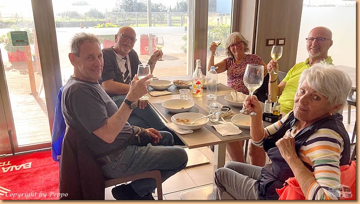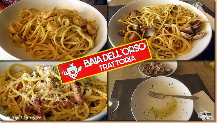| Rosmarie und Franz kommen mit dem Roller nach, Ziel ist die Trattoria Baia dell' Orso. Nudelessen ist angesagt, alles schmeckt wieder hervorragend und wir sind zufrieden. |