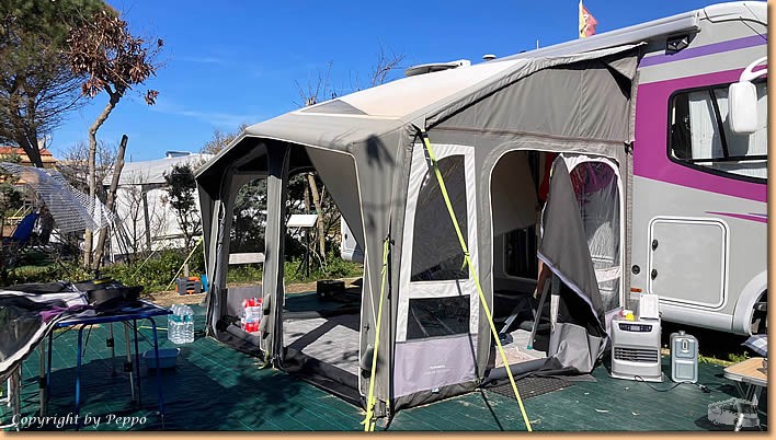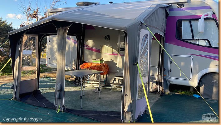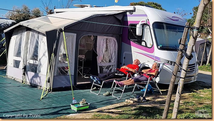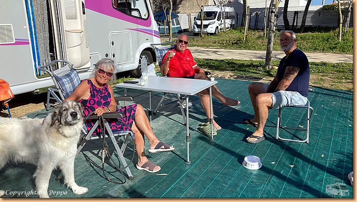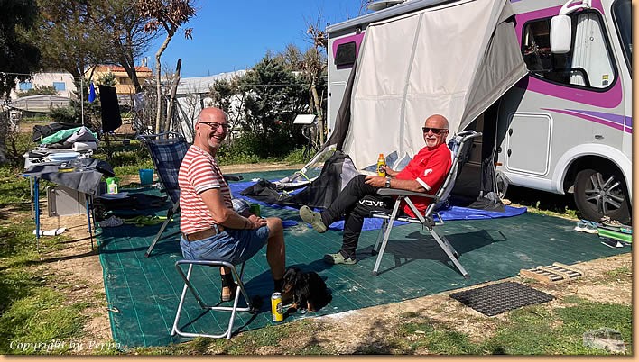 | Dann geht's weiter und am frühen Nachmittag ist alles unter Dach und Fach. Alles gut verstaut, kommt unser Vorzelt doch erst wieder Mitte November zum Einsatz. Roland mit seiner Aloha kommt vorbei, Franz macht auch einen Zwischenstopp und mit einem Limoncello-Crema wird unser Arbeitstag beendet. |