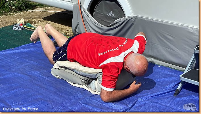 | Heute geht es flott mit dem Zeltabbau weiter. Der Wettergott macht mit und so sind die restlichen geputzten Teile rasch trocken. Pause muss sein, Volker kommt gerade recht |