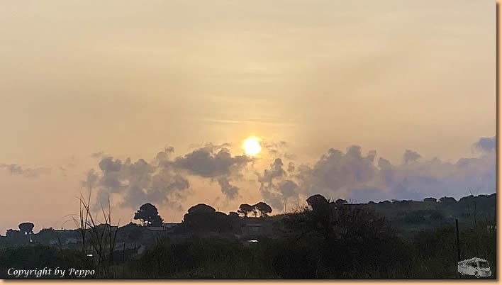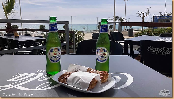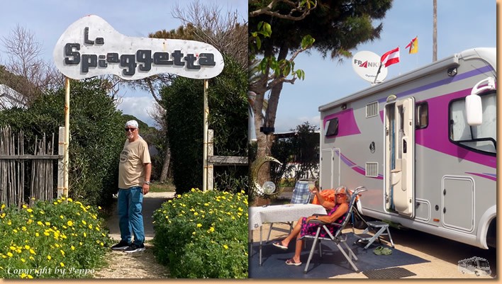 | In der Osteria Tre Colli sitzen wir auf der Terrasse im ersten Stock und lassen uns das Mittagessen schmecken. Anmerkung, für die Grösse der Portionen sind die Preise eindeutig zu hoch. Wein und Ambiente passen und so machen wir uns halb zufrieden auf den Heimweg. Die letzten Sonnenstrahlen nützen wir vorm Womo aus, und dann ist es schon wieder Zeit für unsere diversen Schreibarbeiten. |
