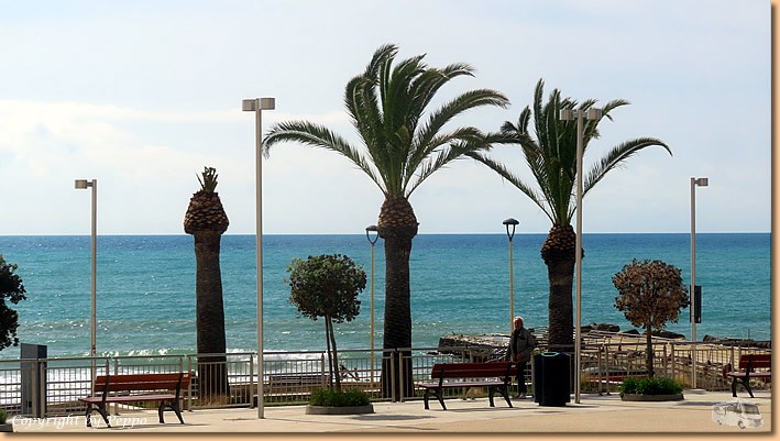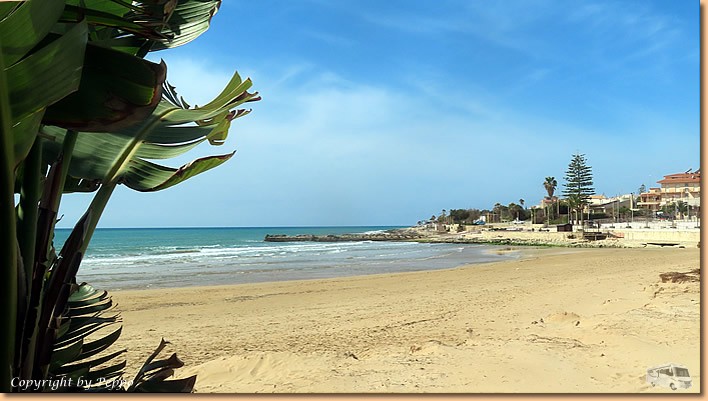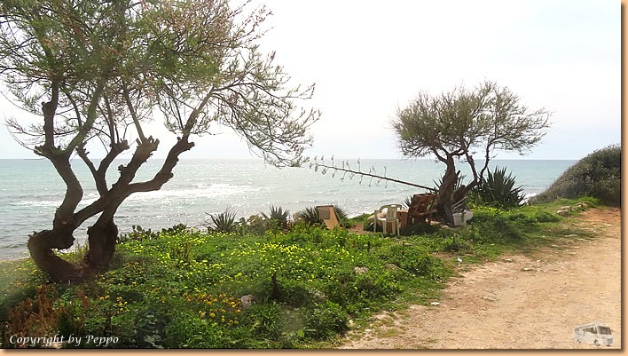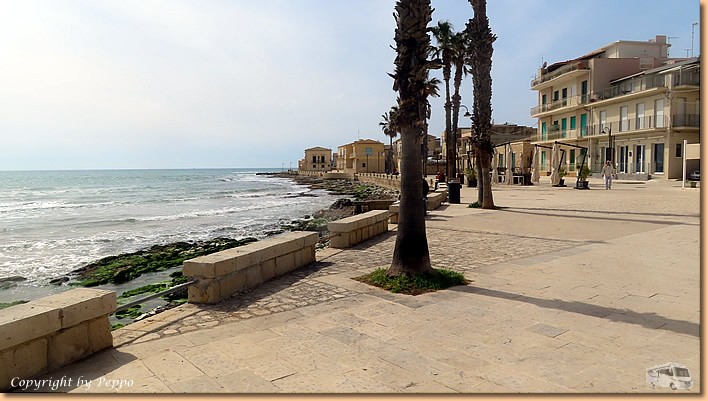 | Helga marschiert heute morgen gleich nach Marina di Modica und kommt nach 10,5 km höchst zufrieden wieder retour. Gemeinsam machen wir uns dann auf zum Erkunden der Gassen und der Promenade von Sampieri. Verändert hat sich seit unserem letzten Besuch hier nichts Auffälliges. Gottseidank haben die Stürme nicht allzu viele Schäden verursacht. |