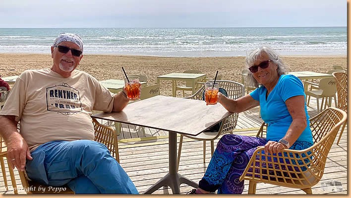 | Unsere Pata-Pata Bar ist auch o.k. und so können wir einen Aperol bei Sonnenschein und Blick aufs Meer geniessen. Den Klippen entlang spazieren wir wieder nach Hause und machen es uns vorm Womo gemütlich. Mit unseren Bekannten plaudern, den Magen füttern und schon ist es wieder Zeit für den Innendienst. Nett war's heute, morgen wollen wir wieder radeln. |