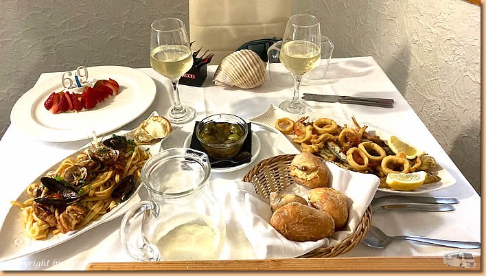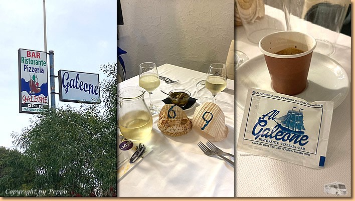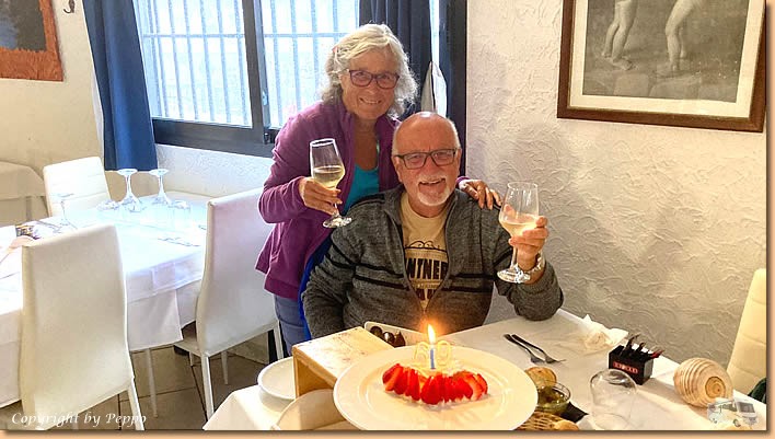 | Herzlichen Dank an meine Familie und an alle Freunde und Bekannten die mich so zahlreich per Telefon und Whattsapp daran erinnert haben, dass ich wieder ein Jahr älter geworden bin. Ich habe mich über jeden Glückwunsch sehr gefreut. Blumen und Kuchen bringt Helga von ihrer Morgenrunde mit und so beginnt der Tag mit einem gemütlichen Frühstück. Die Sonne macht sich heute rar und auf dem Weg ins Ristorante Al Galeone fängt es dann auch zu nieseln an. |