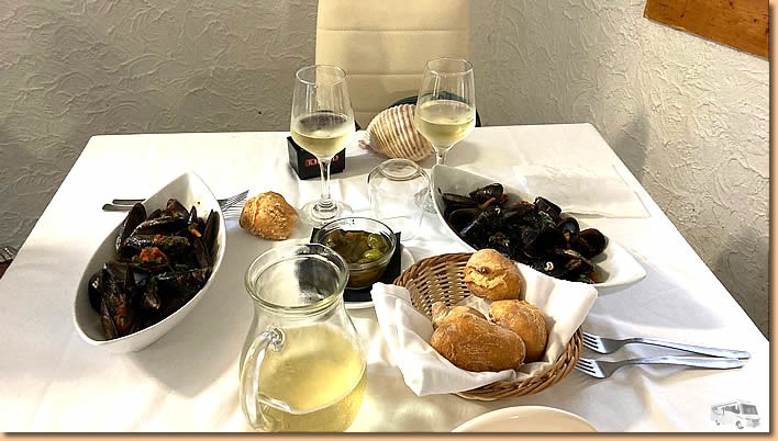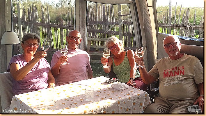 | Wir können dankend ablehnen und kommen nahezu trocken beim Womo an. Nach den üblichen Computerarbeiten gibt's natürlich noch ein Glas vino, Salute auf einen schönen Tag. |