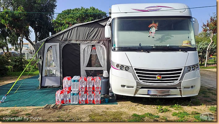 | Weiter geht's zum Einkaufen nach Santa Croce und mit vollen Taschen treffen wir wieder am CP ein. Vorm Womo stehen die bestellten Mineralwasserflaschen, vielen Dank an den Chef vom Maximarkt für die prompte Lieferung. Peter mit seiner Barria kommen auf Besuch, später kommen Ulrike und Wolfgang dazu und schon sitzt wieder eine nette Runde beisammen. |