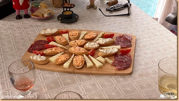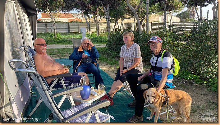 | Die heutige Wettervorhersage, wenig Sonne, Wind und Regenschauer. Gewonnen hat der Sonnenschein und wir sind mit dem Tag sehr zufrieden. Trotzdem bereiten wir uns auf die angesagten Windböen vor, d.h. Luft in den Schläuchen kontrollieren und die Heringe nachziehen. Dann gibt's eine nette Überraschung, Rosmarie und Franz kommen mit vino und Aperitivo vorbei, Ute kommt dazu und gemeinsam wird gefeiert. Liebe Rosmarie, buon compleanno, auguri, auguri, danke für's nette Zusammensitzen. |