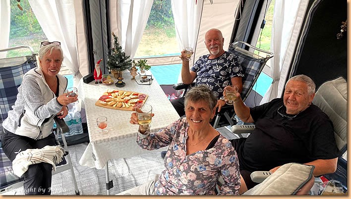 | Schaffen wir auch ganz knapp, kaum im Womo gibt's auch schon wieder liquid sunshine. Im Vorzelt ist es angenehm warm und so laden wir Rosmarie und Franz auf einen Umtrunk ein. Gemütlich geht der Tag zu Ende, morgen schaut's mit dem Wetter ähnlich aus, ändern können wir es nicht, also nehmen wir es mit Humor und einem Glas Glühwein. |