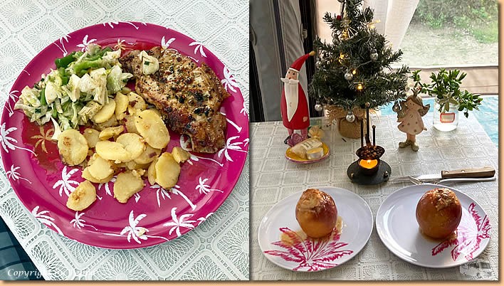 | Das Wetter ist heute nicht prickelnd, Regen und Wind stehen am Programm. Mit einem Wort, komplettes Homeoffice, daher gibts aktuell auch nicht ein Foto. Arbeitseinsatz, die Weihnachtsdeko verstauen, und das Womo ein bisschen auf Vordermann bringen. Gottseidank gibts nachbarschaftliche Hilfe, Wolfgang kommt und eine Grappapause erleichtert doch glatt den Alltag. Am Nachmittag holt uns Rieke um ihre neueste Pfannenerrungenschaft zu begutachten. Für gut befunden, natürlich eins darauf getrunken, mit einem Wort, wir lassen uns vom Wettergott den Tag nicht vermiesen. Die Temperatur fällt, der Wind wird stärker, für heute heisst es Heizung an und ab ins Womo. |