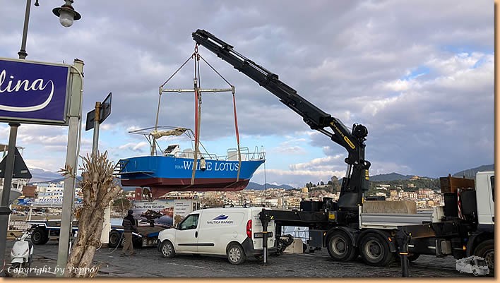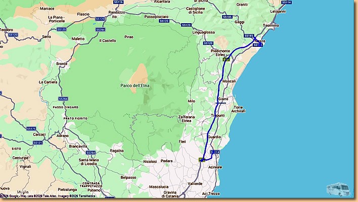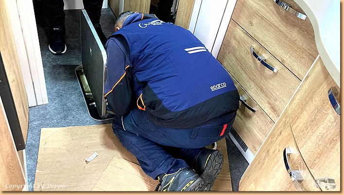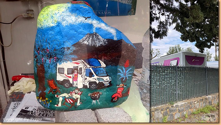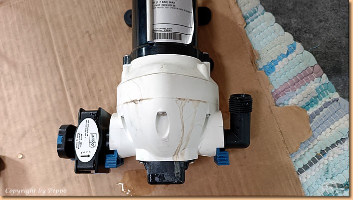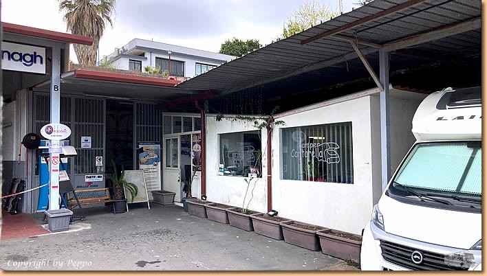 | Wir haben Pläne für den zumindest regenfreien Vormittag, ein Besuch des archäologischen Museums steht an. Doch es kommt oft anders als man denkt. Wir bemerken seit einigen Tagen eine minimale Wasseransammlung im Doppelboden. Ich habe zwar alle Schlauchschellen schon nachgezogen aber die erhoffte Besserung bleibt aus. Und heute kommt auch ein komisches Geräusch und Luftansaugen der Druckpumpe dazu. Entlüften bringt auch nichts, also auf in die Werkstatt. Wir bekommen (bei uns daheim eigentlich undenkbar) am Freitag Nachmittag einen Termin. Pünktlich um 15 Uhr stehen wir in Acireale vorm Tor der Firma Camper Cantarella. Zwei junge Mechaniker erkennen sofort dass die Wasserdruckpumpe undicht ist und machen sich gleich an die Arbeit. |