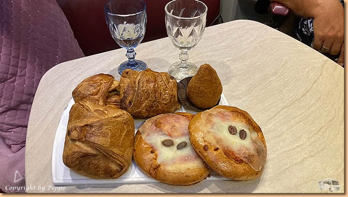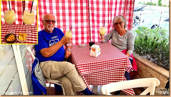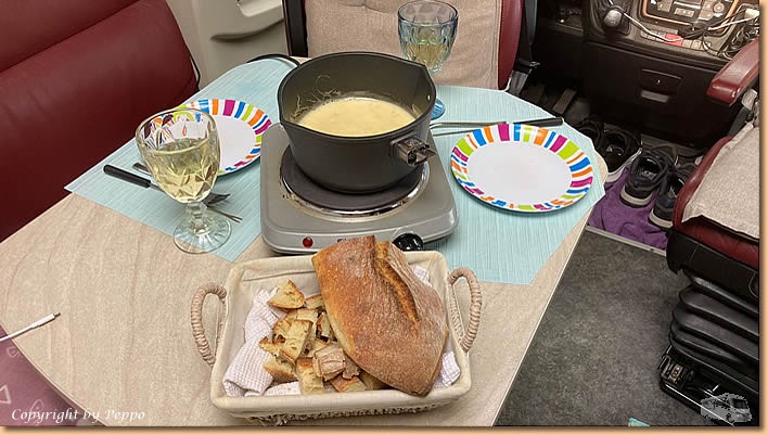 | Wieder daheim kommt Josef zum Plaudern und wie immer vergeht die Zeit wie im Fluge. Da wir auf Schlechtwetter eingestellt waren gibt's heute Käsefondue, aber keine Sorge, es schmeckt auch bei Sonnenschein bestens. Um 16:30 Uhr machen wir uns auf in die Stadt. Ein Toogoodtogo - Sackerl wartet in der Bar San Giovanni auf uns. Lauter pikante Sachen, Aperitivi für die nächsten zwei Tage gerettet und Nachbar Josef bekommt auch noch was ab. |