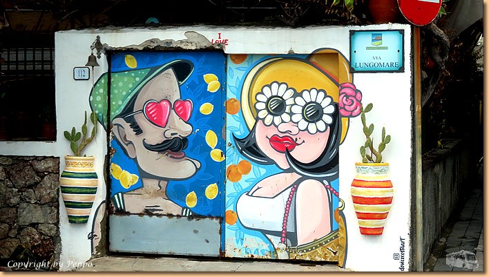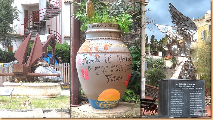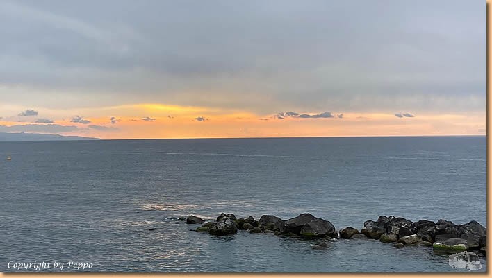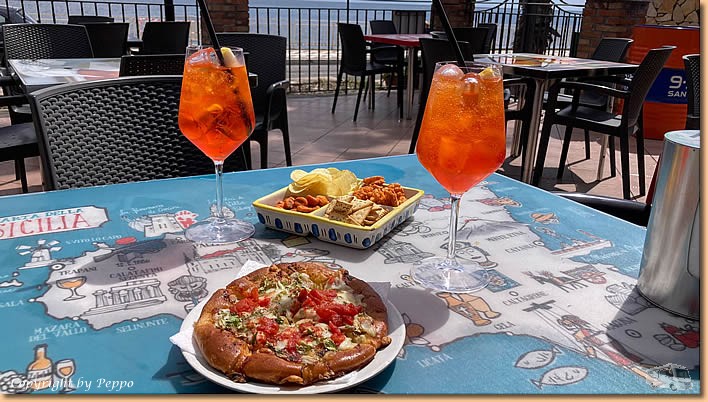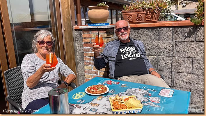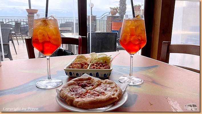 | Das chaotische Wetter setzt sich heute fort. Bis um ca. 11 Uhr sind Regenschauer, dann setzt sich endlich die Sonne durch. Für uns heisst es raus aus dem Womo und wohlweislich ausgerüstet mit Schirm und Regenjacke geht's auf nach Sant'Alessio. Dem Lungomare entlang und dann durch die Stadt retour. Ein Einkehrschwung in unserer Bar ist Pflicht und da die Sonne im Moment die Oberhand hat gibt's unseren Aperitivo im Freien. |