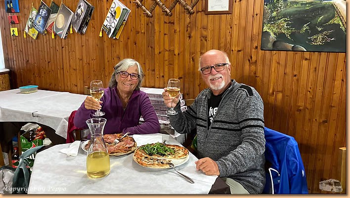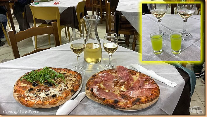 | Am Heimweg kommen die Schirme wieder zum Einsatz und bis 17:30 Uhr fühlen wir uns im Womo ganz wohl. Und wenn die Pizzen im Ristorante Trocadero rufen heisst es, Schirme auf und ab in die Stadt. Vom Chef herzlichst begrüsst schmeckt es wie immer ausgezeichnet. |