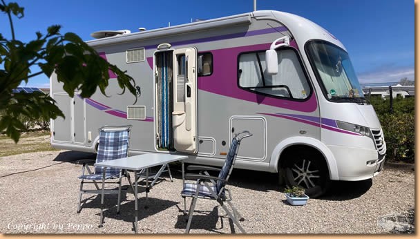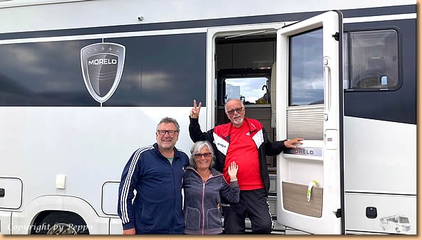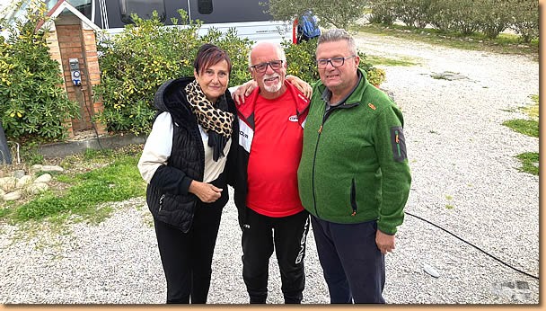 | Von Alessandra herzlichst begrüsst stehen wir auch bald auf einer schönen und grossen Parzelle. Und flott wie wir sind, Sessel und Tisch raus und den obligaten Ankommensschluck geniessen. Lange dauert es nicht und wir bekommen lieben Besuch. Max kommt zur Begrüssung vorbei und auch Marina und Tiziano freuen sich über ein Wiedersehen. Immer wieder nett liebe Camperfreunde zu treffen, wie gesagt, irgendwann und irgendwo trifft man sich immer wieder. |