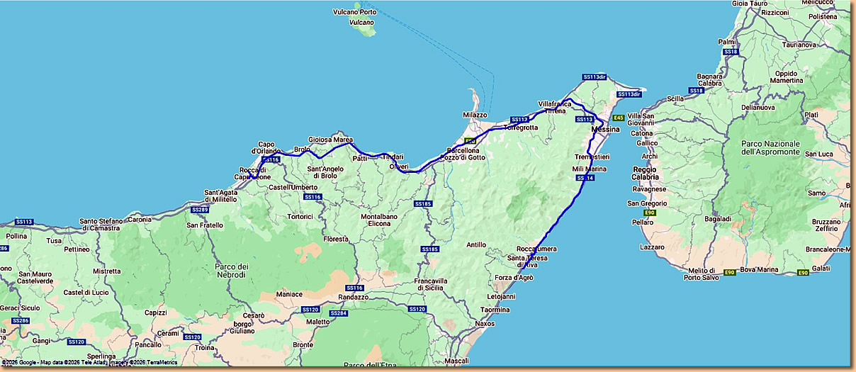 | Ciao Nino, ciao Sant'Alessio, trotz bescheidener Wetterlage waren es neun schöne Tage. Für uns geht's weiter nach Capo d'Orlando. Ein paar Regenschauer begleiten uns auf der Fahrt, die uns aber nicht daran hindern problemlos in kürzester Zeit am Agricampeggio Alessandra einzuchecken. |