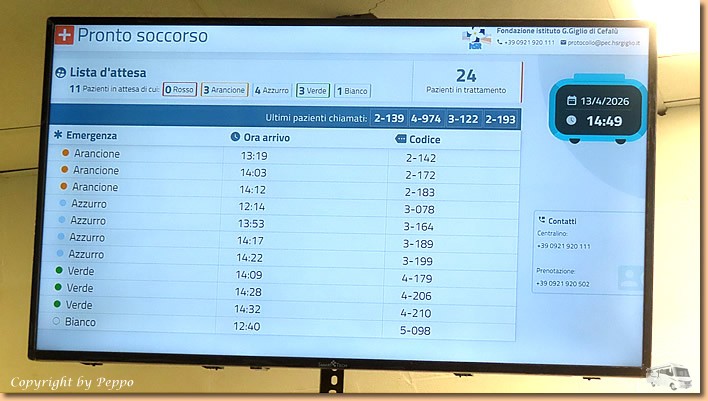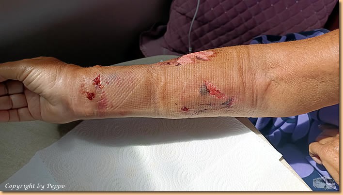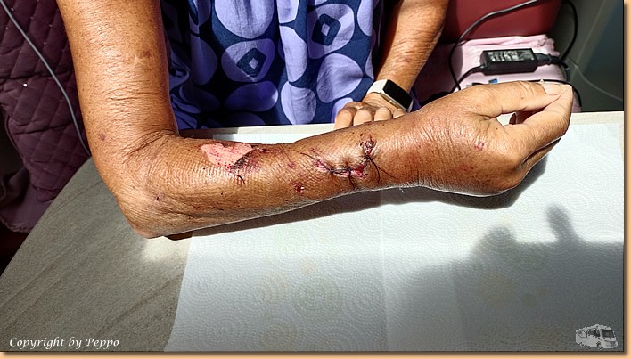 | Retour am Platz, Zwischenstopp bei langjährigen Camperfreunden, ein bisschen plaudern und natürlich die Hunde begrüssen. Kurz gesagt, der sonst friedliche und für Streicheleinheiten immer zu habende Rottweiler hat im wahrsten Sinne die Schnauze von Helga voll und zeigt es mit einer Beissattacke. Das Ergebnis, der Unterarm ist stark lädiert. Wir werden von unseren Nachbarn sofort in die Notaufnahme nach Cefalu gefahren. Um 14:09 Uhr werden wir nach Vordrängen vom Computer erfasst und erst um 20:25 Uhr, nach dreimaliger Urgenz, sieht Helga zum ersten Mal einen Medico und die Wundversorgung. |