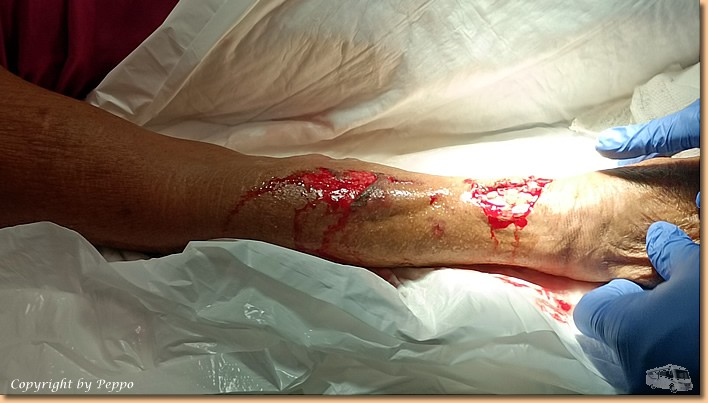 | Der wollte uns gleich weiter nach Palermo zu einem plastischen Chirurgen schicken. Lange Diskussionen, Röntgen und da zum Glück die Arteria radialis, die Sehnen und auch kein grösserer Nerv beschädigt sind, geht's dann endlich ans Nähen. |